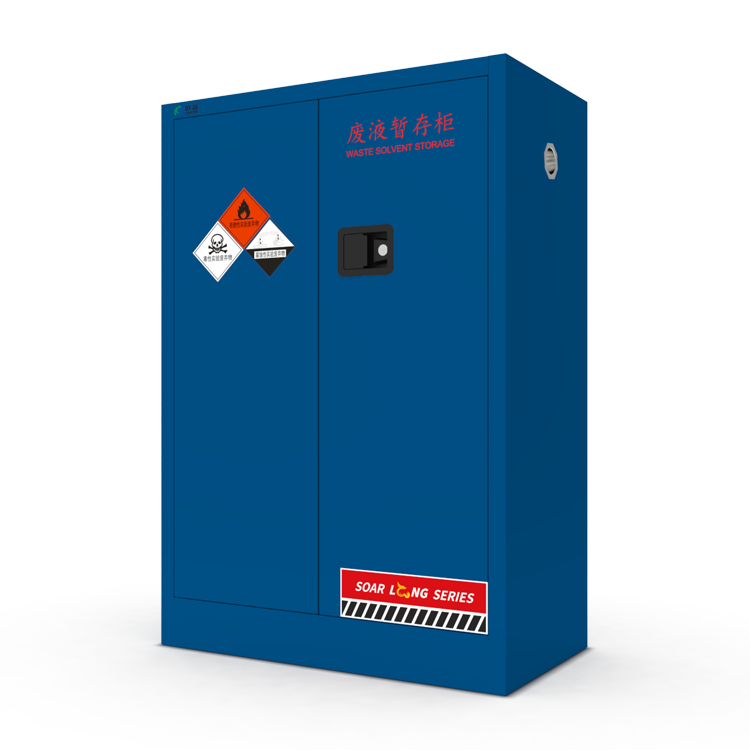 实验室废液暂存柜专为腐蚀性、有毒化学品规范存储而设计,重点突出六大核心优势:柜体采用防火膨胀密封件(符合GB16807-2009),有效阻隔火势蔓延;配备双机械/密码锁系统,符合GA/T73标准,实现双人双锁安全管理;每层设防漏液孔及硅胶导管,可集中收集漏液,防止交叉污染;两侧配置防爆通风口,支持外接排风系统;柜底装带刹车万向轮,移动灵活、定位稳固;柜门贴有耐腐蚀警示标签,强化操作安全意识,全面保障危化品存储与使用安全。