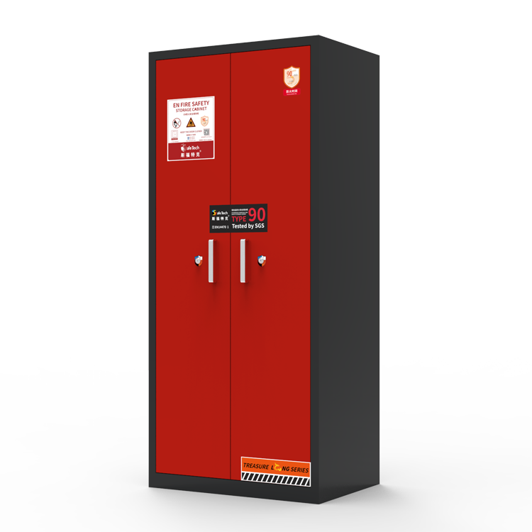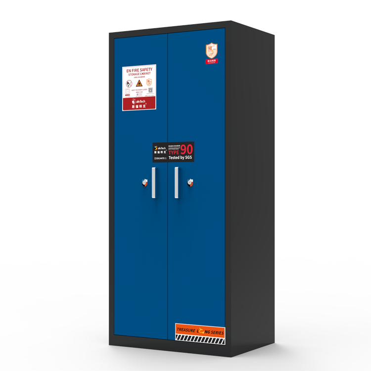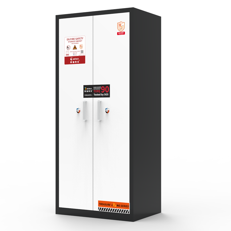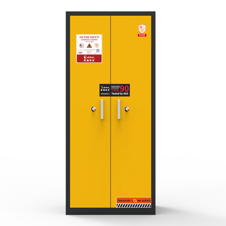LY- SC30欧标防火储存安全柜主体 1.5-3.0mm 厚钢板喷涂,表面喷涂耐酸碱防火漆,内嵌多层复合防火材料,有效隔离火焰与高温,耐火90分钟(经900-1000℃测试),热感闭合系统,在环境温度超过 50℃时,柜门自动关闭;超过 70℃时,排风阀门自动关闭,超过110°时,门缝四周受热膨胀密封。配备双锁管理、静电接地与标准通风口,确保操作安全。内置漏液收集槽与可调层板,实用便捷,保障实验室及工业场所合规存储。