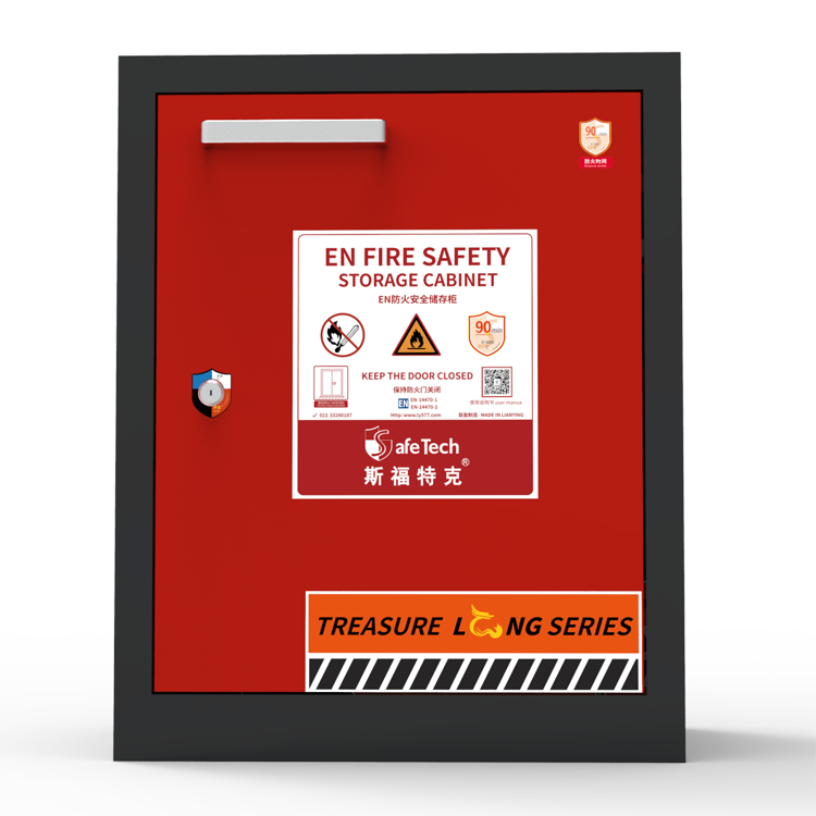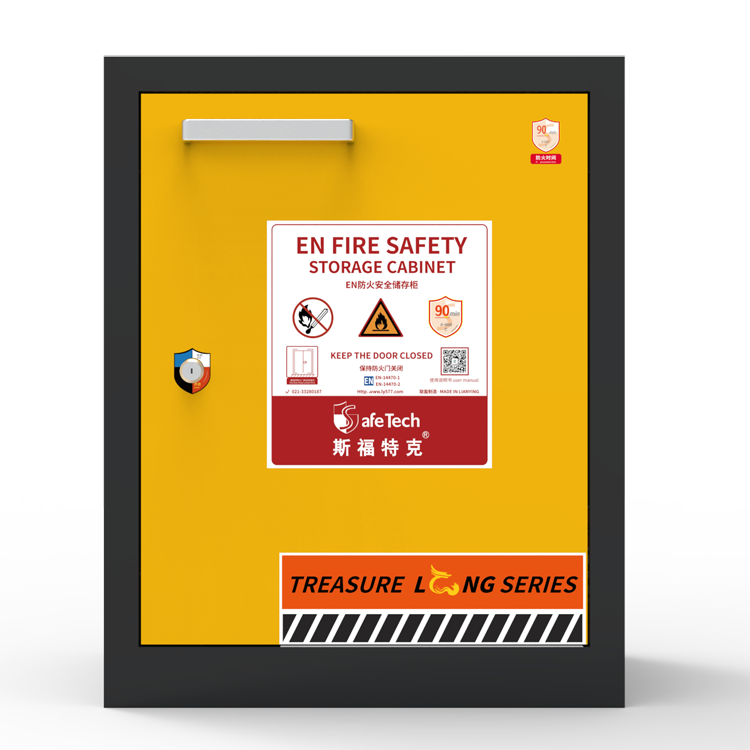 LY- SC12欧标防火储存安全柜主体 1.5-3.0mm 厚钢板喷涂,表面喷涂耐酸碱防火漆,内嵌多层复合防火材料,有效隔离火焰与高温,耐火90分钟(经900-1000℃测试),热感闭合系统,在环境温度超过 50℃时,柜门自动关闭;超过 70℃时,排风阀门自动关闭,超过110°时,门缝四周受热膨胀密封。配备双锁管理、静电接地与标准通风口,确保操作安全。内置漏液收集槽与可调层板,实用便捷,保障实验室及工业场所合规存储。