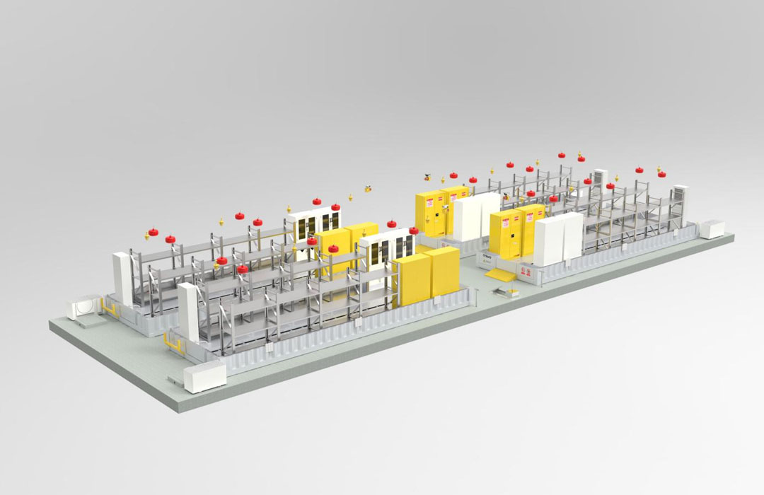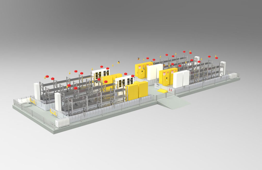 设施包含箱体、防爆电路系统、照明系统、温控系统、逃生系统、消防系统、视频监控系统、通风过滤系统、漏液回收系统、个人防护系统、内部存储系统、门禁系统、智能控制嵌入式硬件系统、智能控制软件系统、防雷系统及附属基础设施自动灭火系统、顶部泄压系统、安全疏散系统、防鼠虫侵入系统