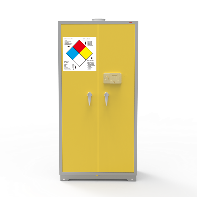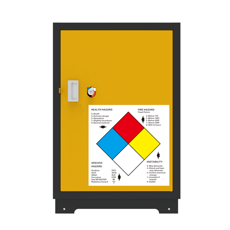 LY-SC12美标防燃安全储存柜专业化学品安全储存柜,专为规范存储易燃及可燃物质而设计。严格遵循OSHA色标体系,提供红、黄、蓝、白四色分区,红(可燃液体)、黄(易燃液体)、蓝(弱酸腐蚀性液体)、白(毒性化试剂)四种颜色储存不同类型化学品,实现危险化学品的视觉化分类管理与快速识别。不仅提升日常管理效率,更在紧急情况下助力消防人员精准判别风险,保障应急处理安全高效,显著降低事故隐患。