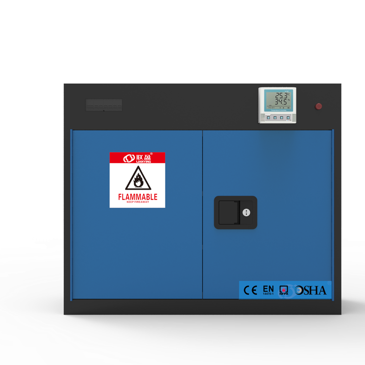 LY-SC22美标防燃安全储存柜专业化学品安全储存柜,专为规范存储易燃及可燃物质而设计。严格遵循OSHA色标体系,提供红、黄、蓝、白四色分区,红(可燃液体)、黄(易燃液体)、蓝(弱酸腐蚀性液体)、白(毒性化试剂)四种颜色储存不同类型化学品,实现危险化学品的视觉化分类管理与快速识别。不仅提升日常管理效率,更在紧急情况下助力消防人员精准判别风险,保障应急处理安全高效,显著降低事故隐患。