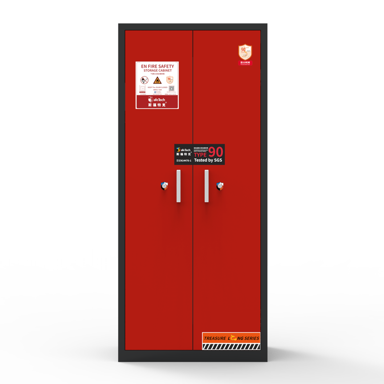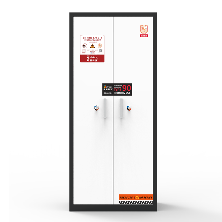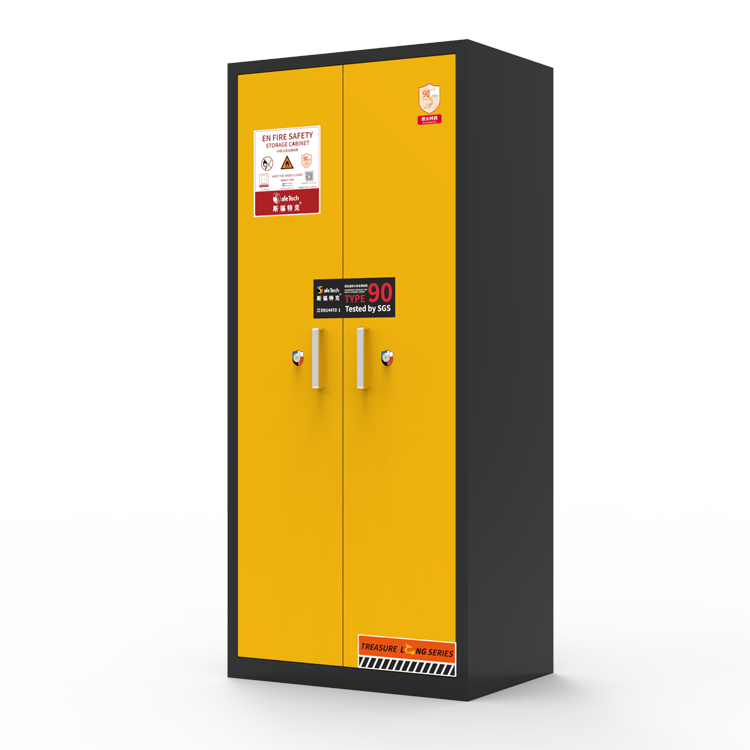 LY- SC30欧标防火储存安全柜主体 1.5-3.0mm 厚钢板喷涂,表面喷涂耐酸碱防火漆,内嵌多层复合防火材料,有效隔离火焰与高温,耐火90分钟(经900-1000℃测试),热感闭合系统,在环境温度超过 50℃时,柜门自动关闭;超过 70℃时,排风阀门自动关闭,超过110°时,门缝四周受热膨胀密封。配备双锁管理、静电接地与标准通风口,确保操作安全。内置漏液收集槽与可调层板,实用便捷,保障实验室及工业场所合规存储。