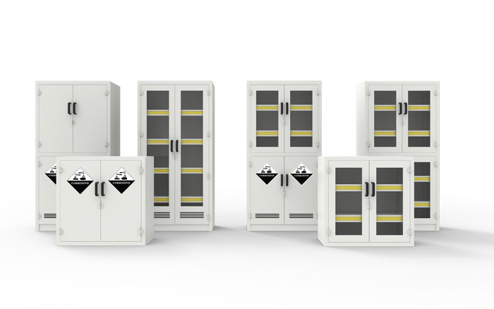 实验室早期药品柜、试剂柜、器皿柜,以木芯板贴防火板、铁皮烤漆、不锈钢制,容易氧化、脱胶、腐蚀等问题。现实验室根据化学品的特性来选择相符合的储存柜,保障操作者及周围人群安全。